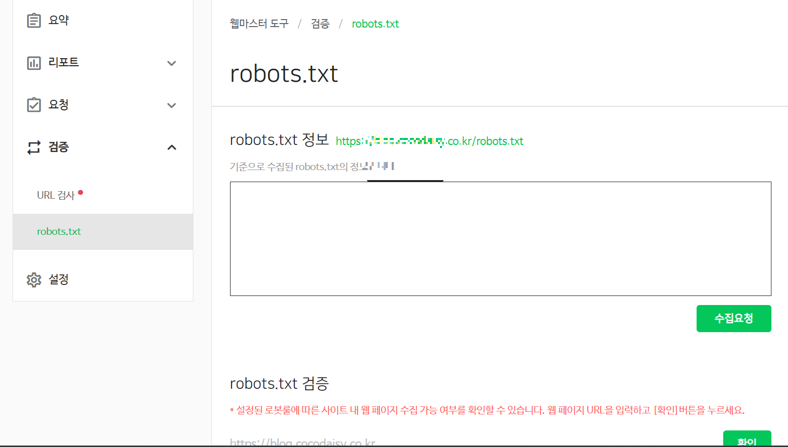 왼쪽에 있는 사이드바 메뉴 중, 검증 - robots.txt 를 클릭해줍니다.