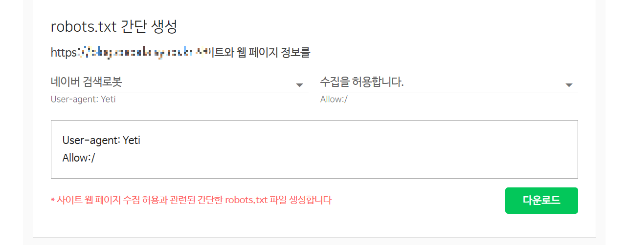 네이버 검색로봇 또는 모든 검색 로봇을 선택한 뒤, 다운로드 한 robots.txt 파일을