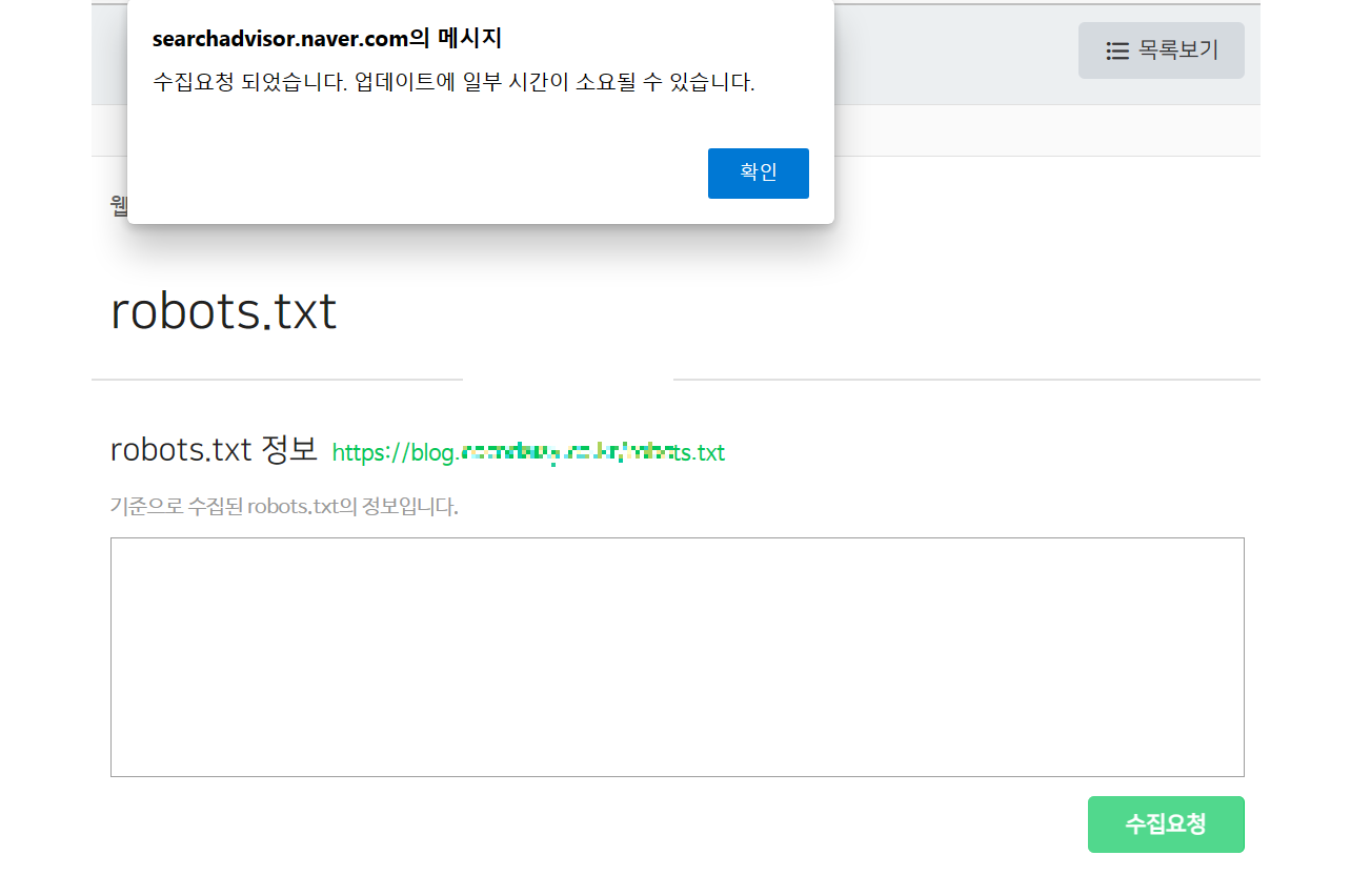 robots.txt 검증에 사이트를 적고 '확인'을 눌러준 뒤,